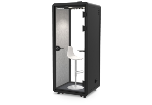 Kompakte Telefonkabine fuer Zuhause und Buero. Warmweisse LED, Steckdose/USB und leise Lueftung. Optionen fuer Oberflaeche, Tueranschlag und Glas.